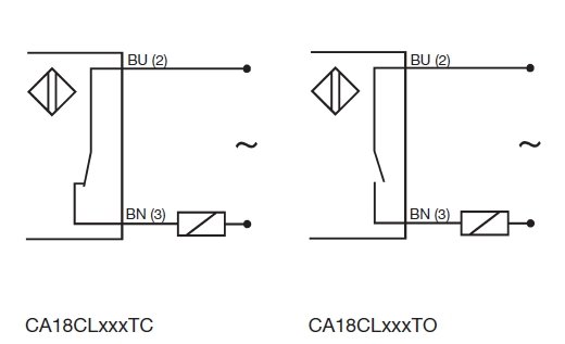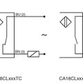Capacitive sensors in M18 thermoplastic body with adjustable (potentiometer) sensing range of 3 - 8 mm or 3 - 12 mm. The CA18CL ... are two-wire sensors with AC wide area power supply and output NO or NC (depending on model).