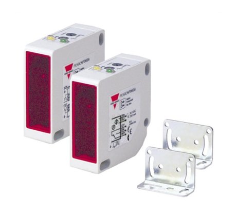 Through-beam, relay output photoelectric sensors in rectangular body PC/ABS (17x50x50 mm). Integrated switch for mode selection (dark or light) and range adjustment potentiometer. Mounting bracket in delivery contents.