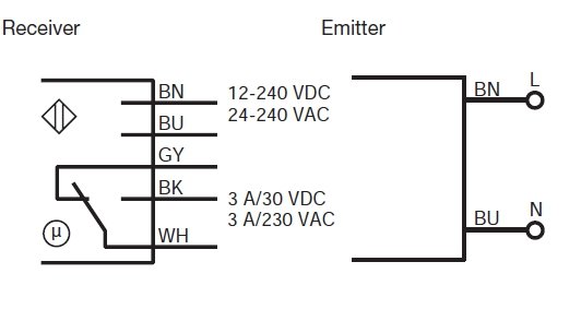 AC/DC through-beam photoelectric sensors with relay output and 20 m sensing range