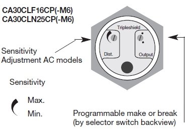 AC/DC capacitive sensors M30 with humidity compensation. Sensing distance: 2-16 mm or 2-25 mm (potentiometer)