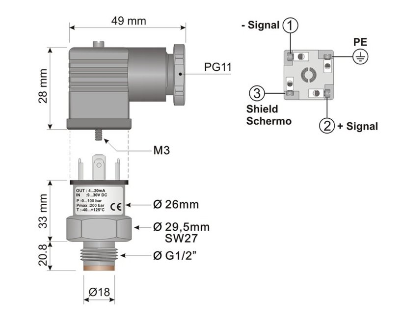 Pressure Transmitter (0 to 1, 4, 6, 10, 25, 100 Bar) with analog output. (-40...+125°C). PIXSYS