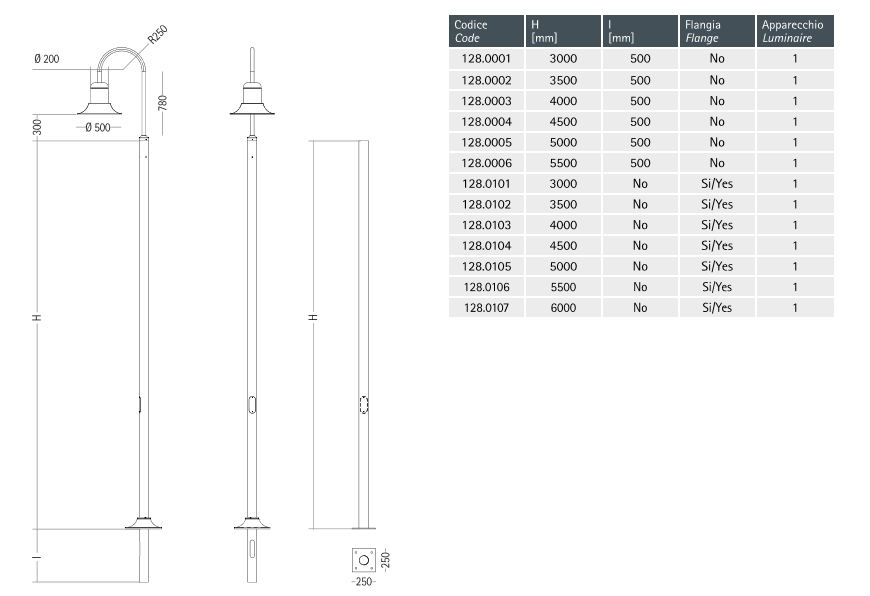 Pole in AISI 316L stainless steel available for underground or with fixing flange installation.