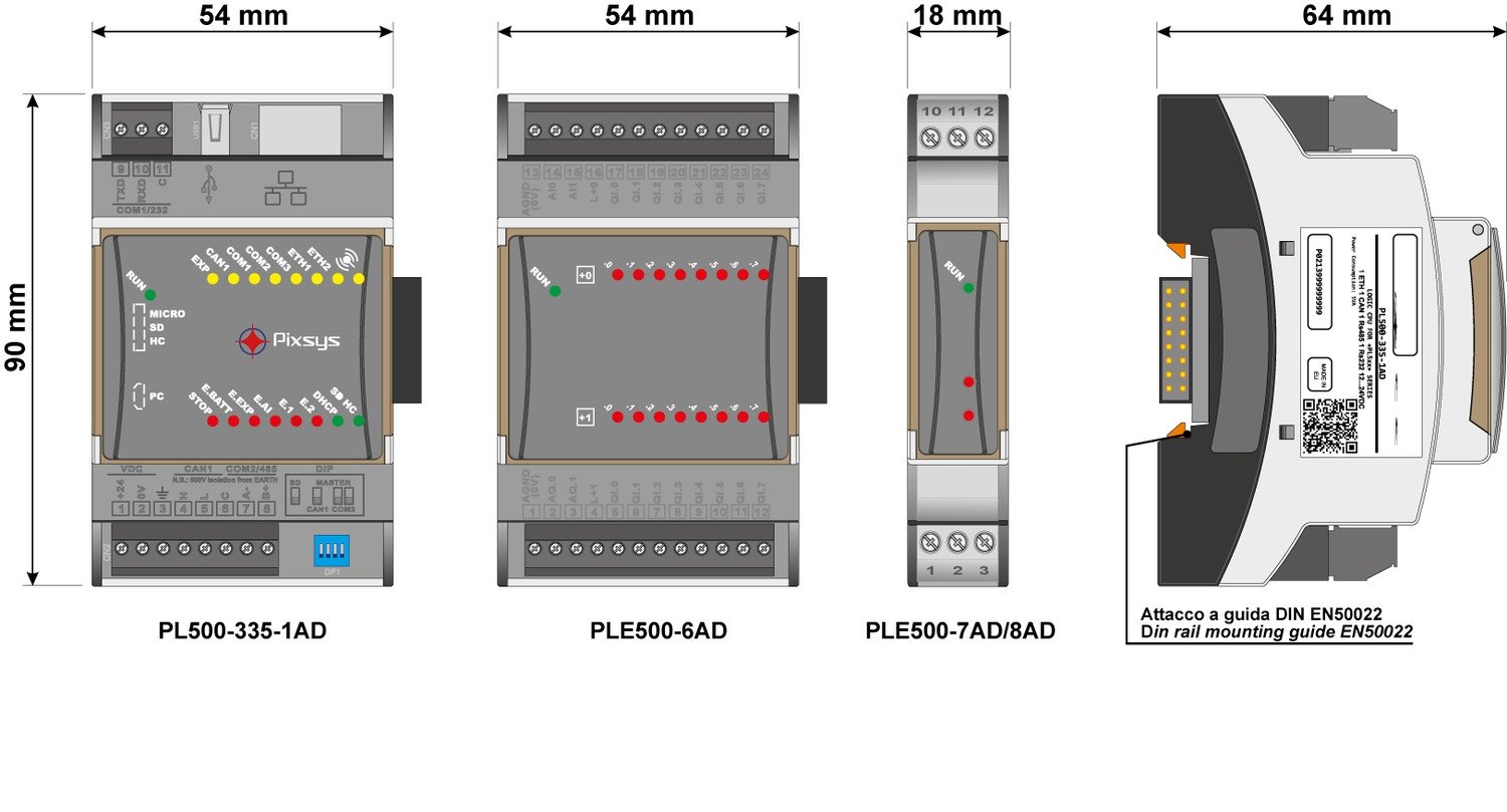 - Dimensions: 3 x modules 54x90x64 (PL500, PLE500-6AD), 1 x module 18x90x64 (PLE500-8AD)