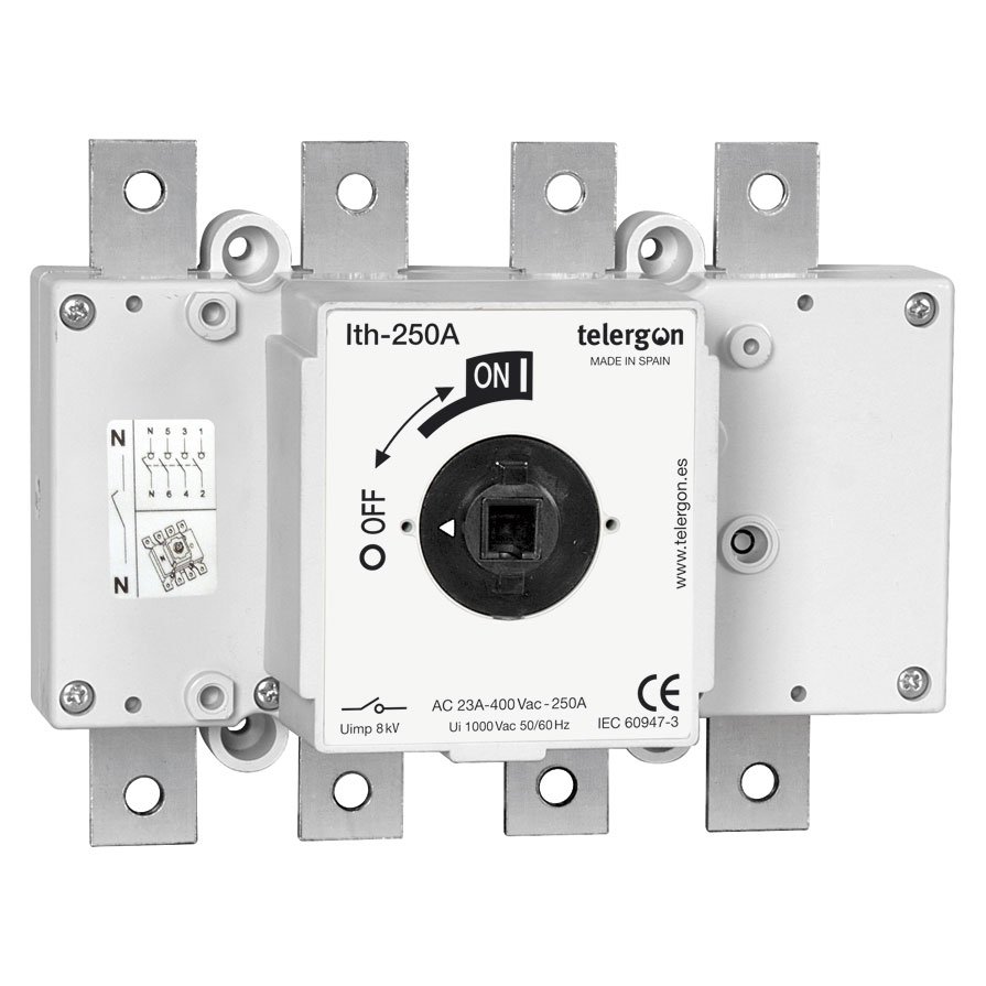 Switch – disconnectors AC on-load, are available from 250A-315A-400A in 3 x , 3 x +N & 4 x versions under request on order. Rated breaking current of up to 8 times the rated operational current, with ability to establish and support short circuit currents up to 100kA. Uninterrupted duties in extreme tropic and polar conditions, as well as the polluted environment of any industrial process. Protection against accidental over voltages in equipments connected between phase and neutral (our standard 3 x +N) with advanced switched neutral pole (early make – late break).