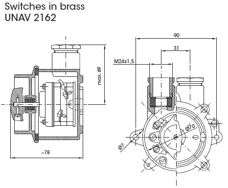 - One-way switches UNAV 2162 in solid brass with UNAV 1948 cable glands 250V IP66