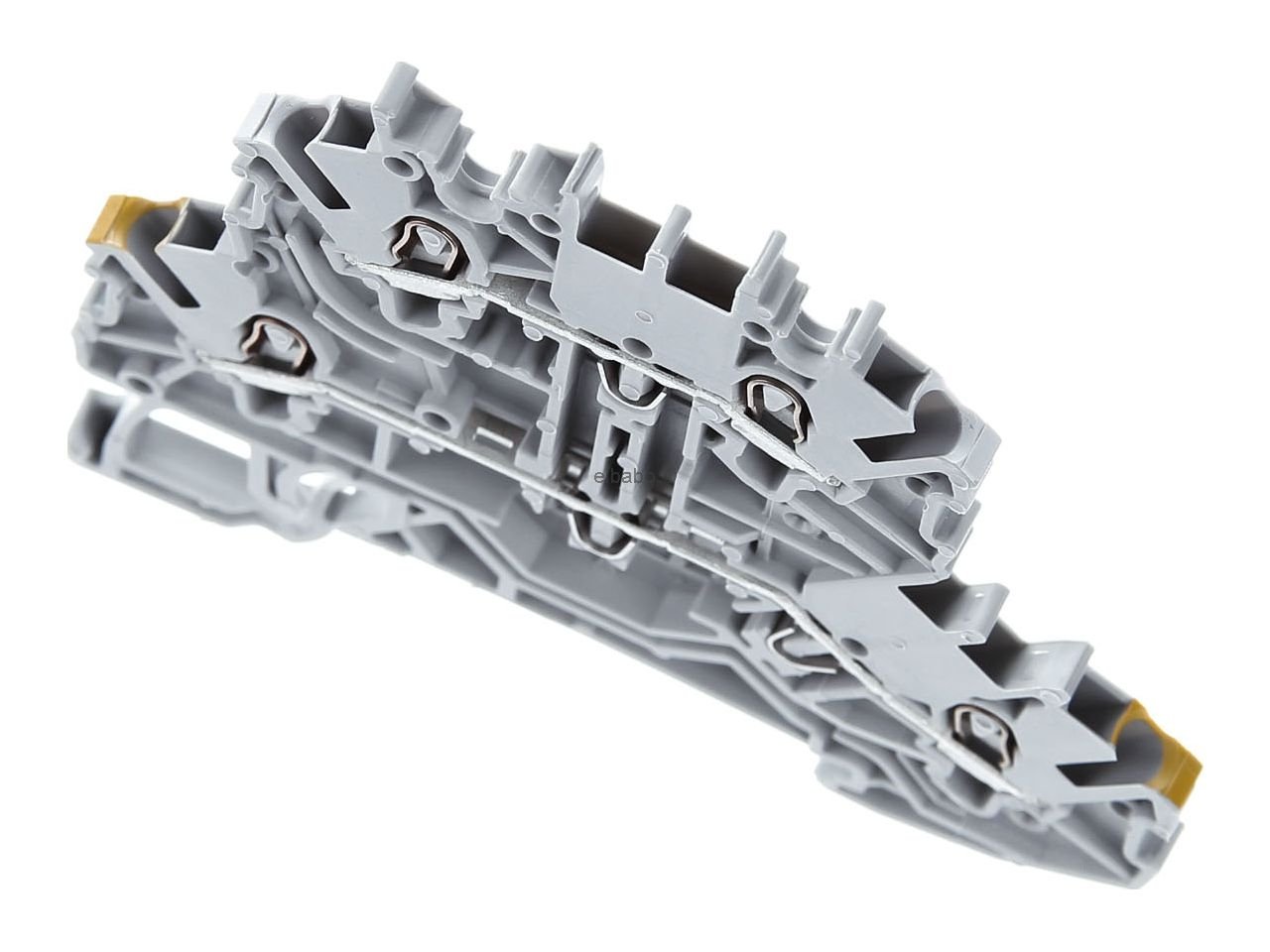 Seamless electrical installations are guaranteed with this double-deck terminal block (item number 2000-2201/352-000). The double-deck terminal block also functions as a through terminal block. Conductors should only be connected to this double-deck terminal block if their strip length is between 9 mm and 11 mm. Featuring conductor terminals along with Push-in CAGE CLAMP®, this connector is highly versatile. Our Push-in CAGE CLAMP® is a universal, maintenance-free connection solution for all conductor types, featuring a winning design: It allows direct insertion of both solid and fine-stranded conductors with ferrules without needing tools. No preparation is required; for example, crimping the conductor's ferrule is not necessary. This double-deck terminal block is suitable for conductor cross sections ranging from 0.14 mm² to 1.5 mm². It has two levels. Two potentials can connect using the four clamping points The gray housing is made of polyamide (PA66) for insulation. These through rail-mount terminal blocks are mounted using DIN-35 rails.