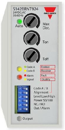 μ-Processor controlled amplifier for one set of photoelectric sensors (type MOFT/R), plug in 11-pin base. The S142 B…. have timers (delay-Off and delay-On), relay and NPN / PNP transistor output, diagnostics for sensors, test during operation, alignment help via LED or alternation of alarm output, level indication for dirt accumulation, manual or automatic emitter power regulation and two emitter codes for high neighbor immunity.