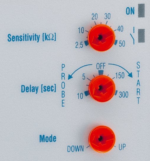 The Lovato Electric level control relay for conductive liquids, which provides the tank emptying or filling control, by rotating the MODE selector, by means of MIN and MAX (or only one) level electrodes. With the “Sensitivity” potentiometer, the adjustment of the relay sensitivity, between 2.5 and 50kΩ, is obtained.