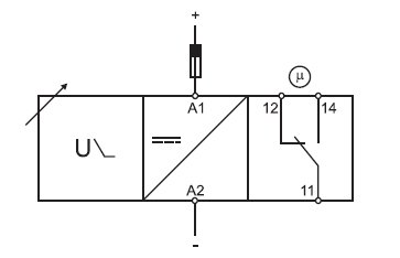 DC under voltage monitoring relays for voltage level of batteries with measurement via the power supply. There are separate potentiometers for setpoint and hysteresis (4-50%).