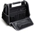 Practical tool bag in robust fabric, with 2 separate compartments to neatly arrange hand tools. Additional equipment may be accommodated via handy hooks and external pockets while documents are safely stored inside. A shoulder strap and sturdy metal handle make it easy to carry.