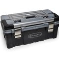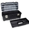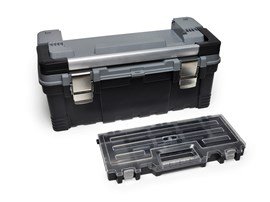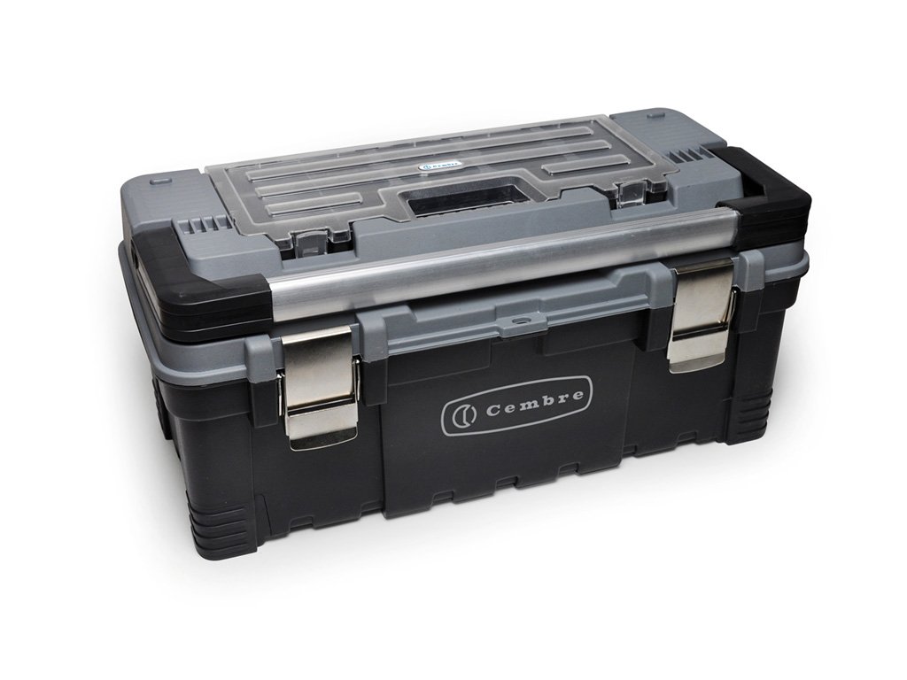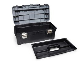 Plastic tool chest with small parts holder on the lid; Removable internal tool tray. Metal latches; Aluminium handle and padlock facility.Sufficiently robust to be used as a step when closed.
