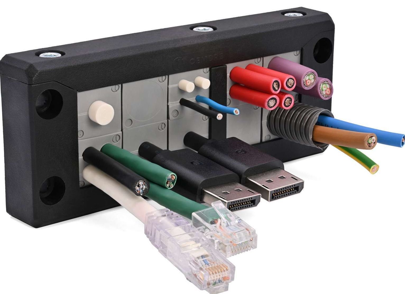 Thanks to the work and study of its technical team, CEMBRE has been able to design a new generation of cable entry systems, characterised by an ergonomic split frame, equipped with an over moulded seal and compatible with grommets with a high degree of protection against the ingress of solid foreign bodies and against the penetration of water.