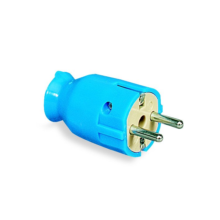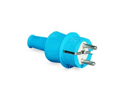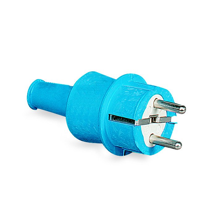 Schuko plugs and connectors in rubber or hermoplastic and blue color RAL5015.