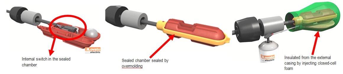 The dirty waters float switches LV FSΝ1 B.. are used in level control of liquids where there are solid materials in suspension, for example sewage or waste water from industrial activities. This float switch is used in the automation of electrical equipment dedicated to the management of hydraulic systems. The switching of the internal contact is generated by the overturning of the float switch when it is completely submerged by the liquid. The overturning is warranted because, in the cable entrance area, a counterweight is inserted; this allows a decentralization of the centre of gravity and then the overturning of the float switch. Thanks to this characteristic the float switch can also be switched in the presence of solid materials in suspension on the surface of the liquid.
