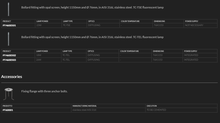 Bollard luminaires in stainless steel AISI 316L.