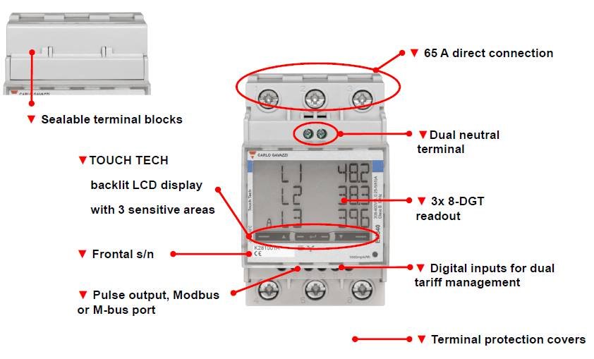 3-phase energy meter/analyser 3x8 digit with direct connection up to 65 A. Carlo Gavazzi