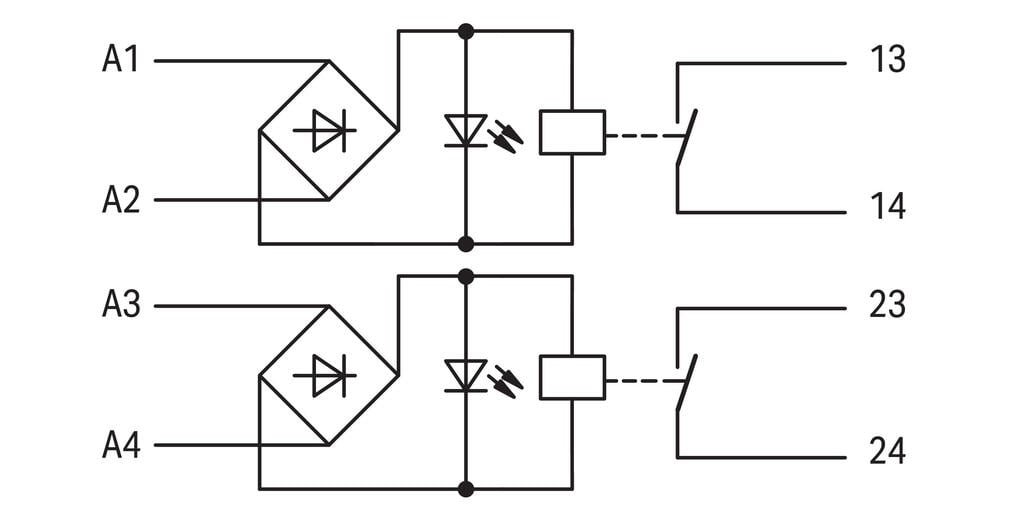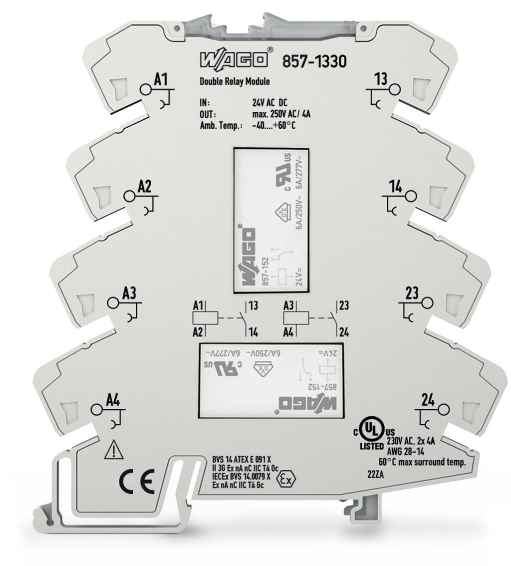 - Double clamp relays (with 2 relays - 1 x NO per relay). 24 V AC/DC power supply