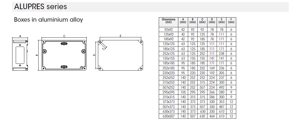 ALUPRES series distribution boxes are a range of products with thick walls made of aluminium alloy for heavy duty uses with IP55 and IP67 protection rating and resistant to UV rays. The system is composed of different sizes with ecological anticorrosion passivation with fluoro-zirconium and finished with hot-polymerised non-toxic polyester paint. All the boxes are complete with back plate made of zinc-tropicalised steel sheet and can be accessorised with blind or windowed cover. The boxes are available in versions totally blind suitable to be drilled with threaded holes, or with window on the sides that allows for modular combinations or to be accessorised with blind or threaded flanges or junctions available in the range.