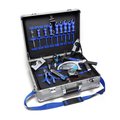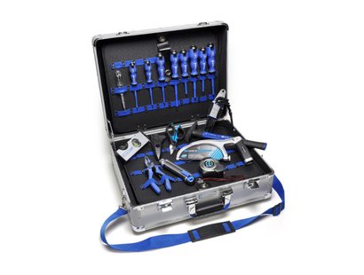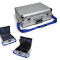 Aluminium case containing two panels with elastic tool holders and an internal pocket for holding documents or a tablet.