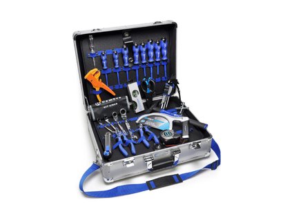 Aluminium case containing two panels with elastic tool holders and an internal pocket for holding documents or a tablet.