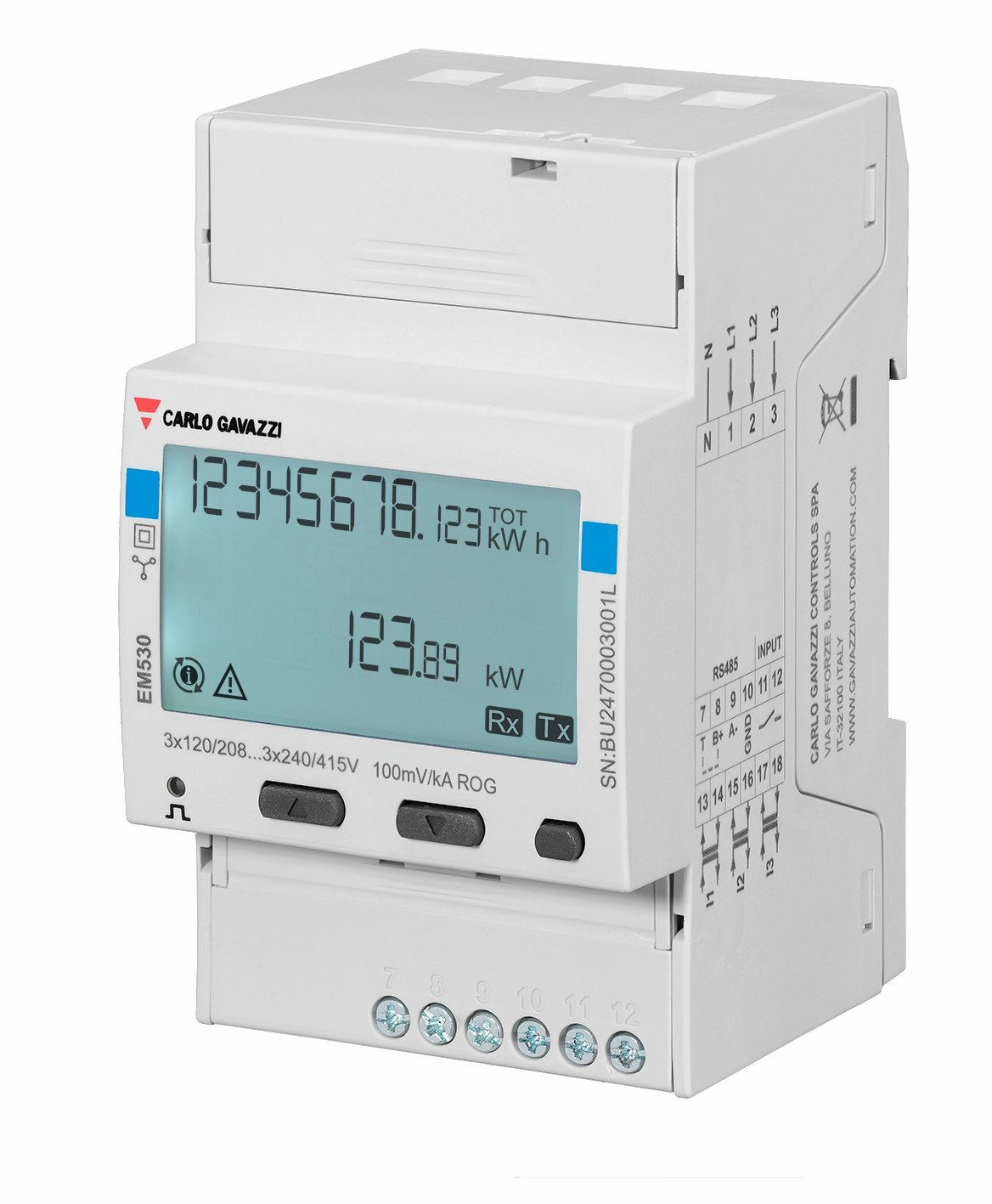 Energy Meters / Analyzers, with CT/5 connection, or Rogowski coils. Up to 10KA. LCD screen and push buttons. Carlo Gavazzi
