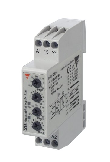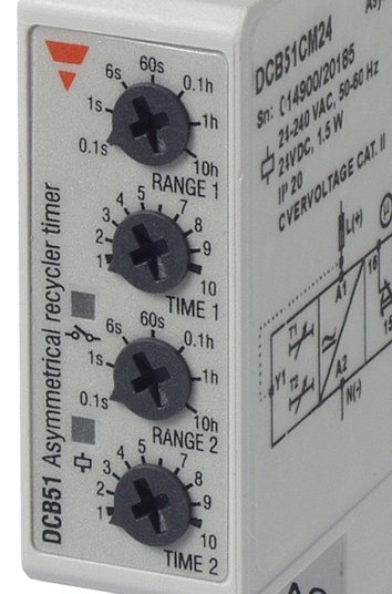 Multi-voltage asymmetrical recycler mini-DIN timers. Time range: 0.1 s - 100 h. Carlo Gavazzi