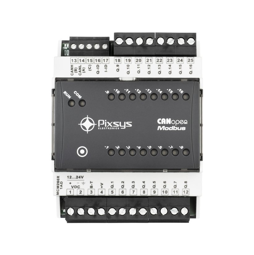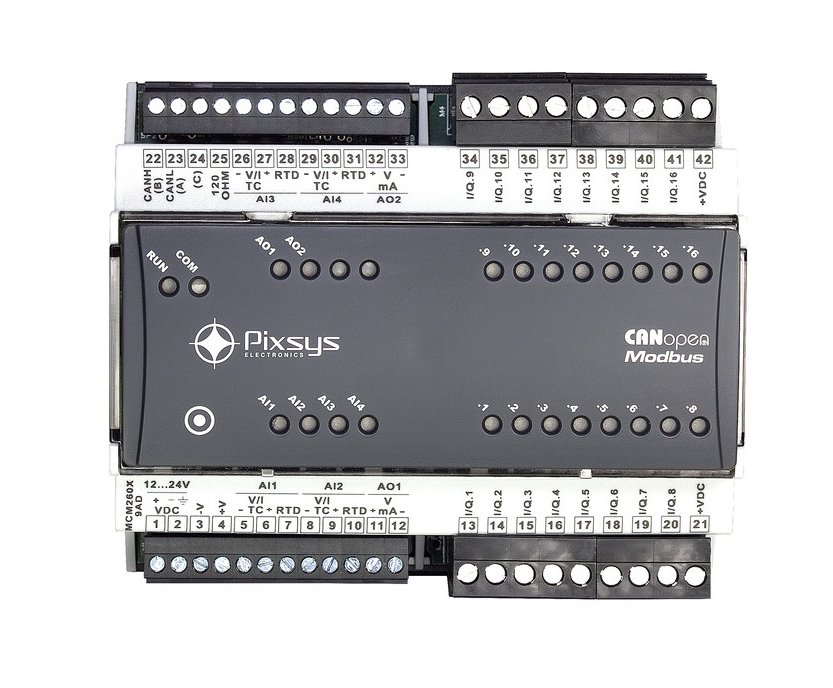 - MCM260X-9AD: Power supply 12..24 Vdc, 4xUniversal analog inputs, 2xAnalog outputs 0-10V / 4..20mA, 16xStatic outputs 12..24Vdc / Digital inputs PNP 12..24Vdc, 4xEncoders/Counters