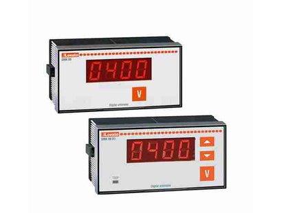 True RMS digital instruments (96x48 mm) for low or medium voltage AC, with the ability to "set" the voltage transformation ratio. The DMK00R1 has a programmable command relay.