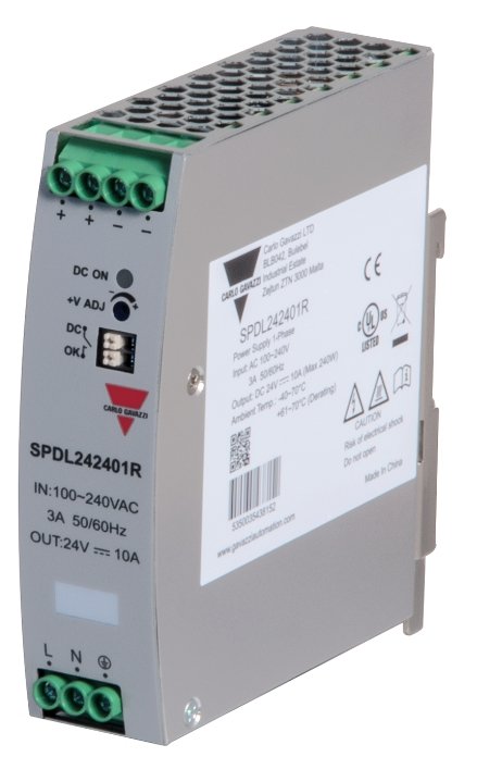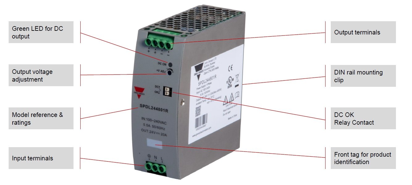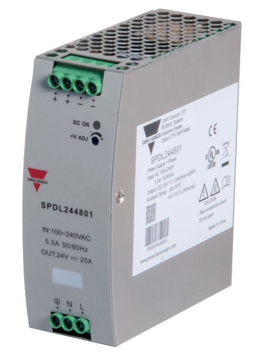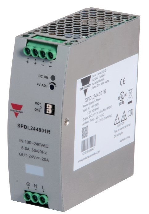 The SPDL series of DIN-rail mount power supplies encompasses high performance within an extremely compact footprint. Power ratings are available in 15, 30, 60, 75, 120, 240 and 480 W, with 12, 24 or 48 VDC output.The SPDL achieves high operating efficiency of up to 95% @ 230 VAC. Features such as DC ok output relay (for SPDL 240 and 480 W model) and built-in protection functions ensure a high degree of reliability during operation.