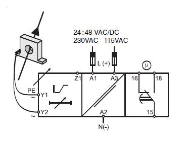 Single phase CT with output 0,4 - 4 V DC for use with overcurrent monitoring relays. Carlo Gavazzi