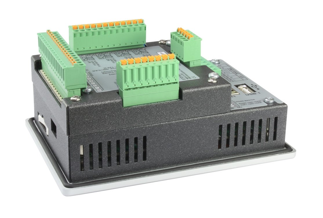 Two serial Buses (RS485), an Ethernet port 10/100/1000 and a CanOpen bus ensure connectivity to the main field buses. It is possible to add digital I/O board ETD1644 with plug-in connection for compact control system or I/O modules MCM260X for extended applications. The USB port, available also on front panel, provides functions such as data exporting, program updates and peripherals connection.