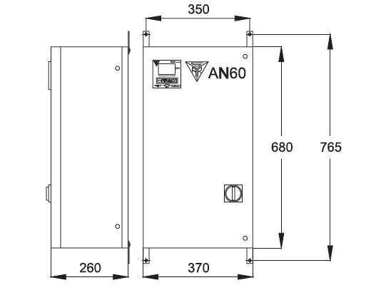 AN60 series is made for wall installation, cable entry form bottom, maintenance form front plant, capacitors climbed on threaded plate, metal case in a strong steel sheet and painted with epoxy resin RAL7035.