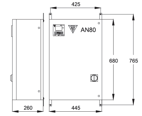 AN80 series is made for wall installation, cable entry form bottom, maintenance form front plant, capacitors climbed on threaded plate, metal case in a strong steel sheet and painted with epoxy resin RAL7035.
