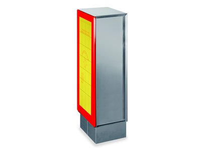 Characteristics: 20m “gomel” fire hose, 45mm diameter. AWG UNI45 nozzle with 3 effects complete with1”1/2 UNI45 brass tap. Flat breakable glass with “SAFE CRASH” patent. The cabinet is supplied with 9W-230V fluorescent lighting, red diffuser and G23 lampholder. Suitable for fastening onto concrete using max. M10 threaded pins (not included).