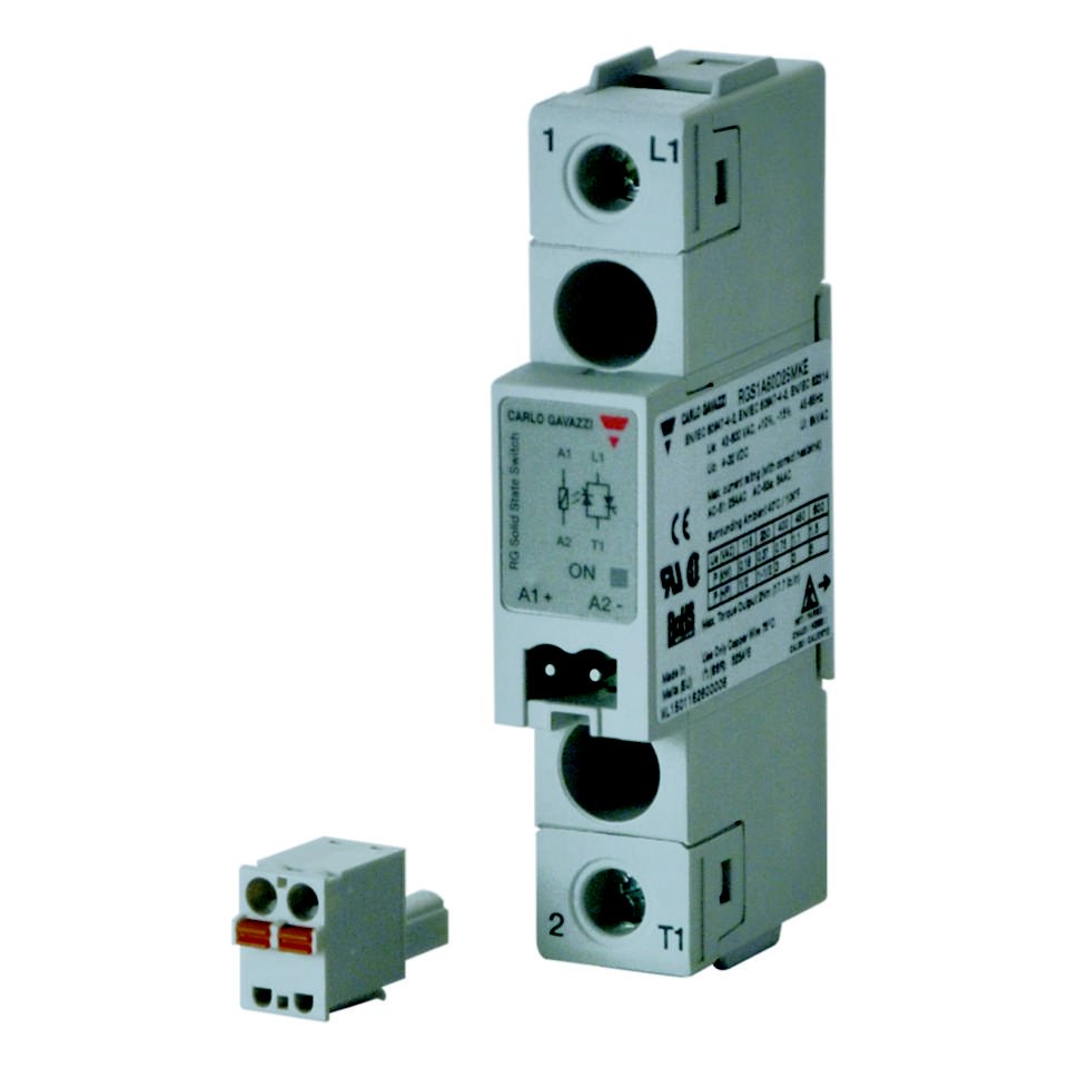 RGS1A_E: solid state devices with width of only 17.5 mm for switching heater and motor loads up to 90 A AC and CONTACTOR terminals connection configuration (load input-output terminals on opposite sides).
