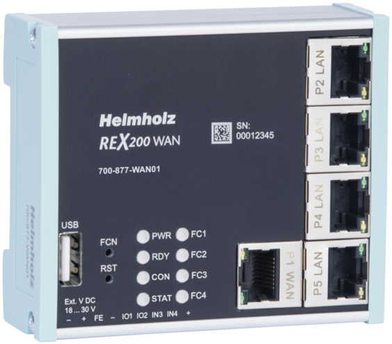 The REX 200 WAN has a WAN interface via which the connection to the myREX24 V2 portal is established. The integrated 4-port switch can be used to connect the Ethernet nodes of the machine to the router on the available RJ45 ports.