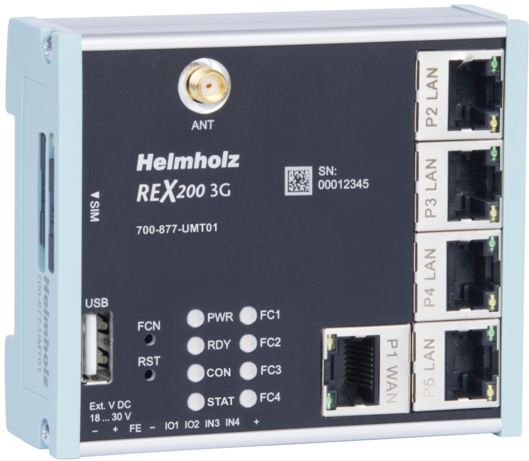 The REX 200 3G has a 3G modem (UMTS) via which the connection to the myREX24 V2 portal is established. The WAN interface, which is also available, can form a fail-over network in conjunction with the 3G modem. The integrated 4-port switch can be used to connect the Ethernet nodes of the machine to the router on the available RJ45 ports.