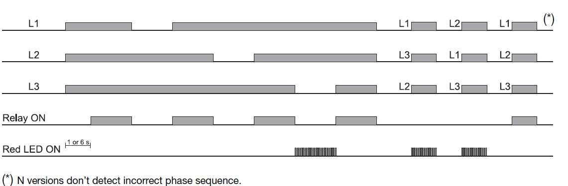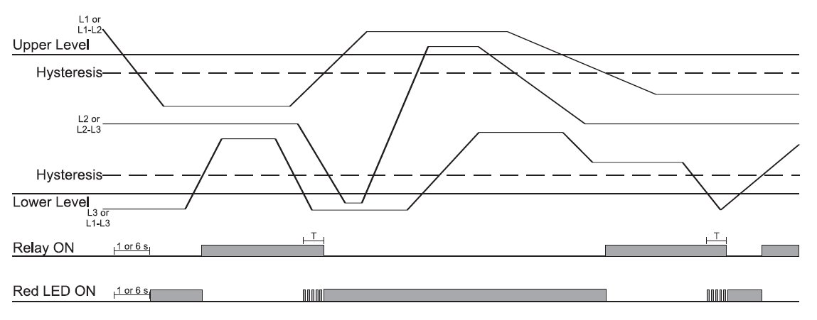 TRUE RMS AC over and under voltage for 3-ph, Phase sequence and phase loss. There are 3 potentiometer on the front side (for voltage setting, for undervoltage setting and for alarm delay time). Also there are DIP-switches (for measuring range, for power on delay and for monitoring voltage).