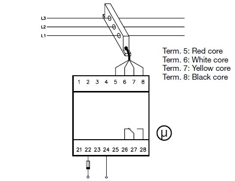 Three phase CT with output 0,4 - 4 V DC for use with over and under current monitoring relays. Carlo Gavazzi