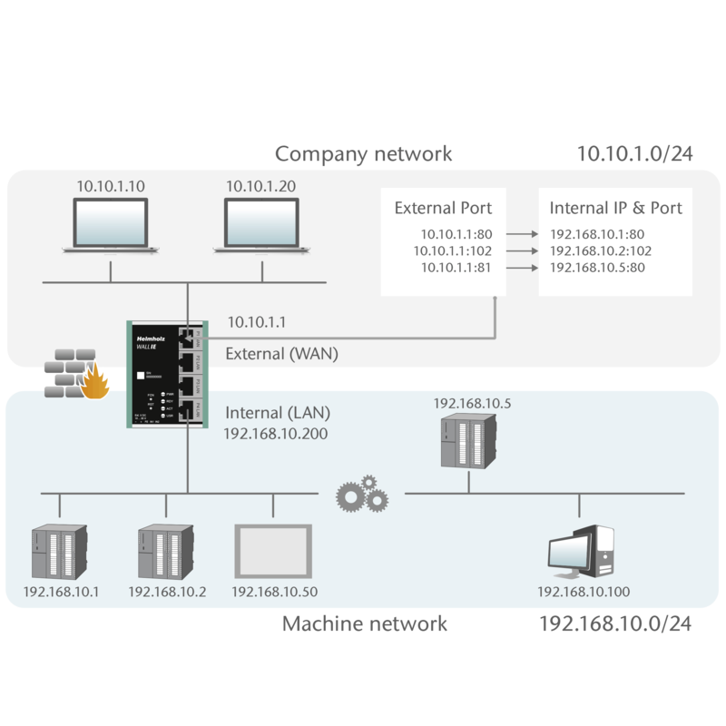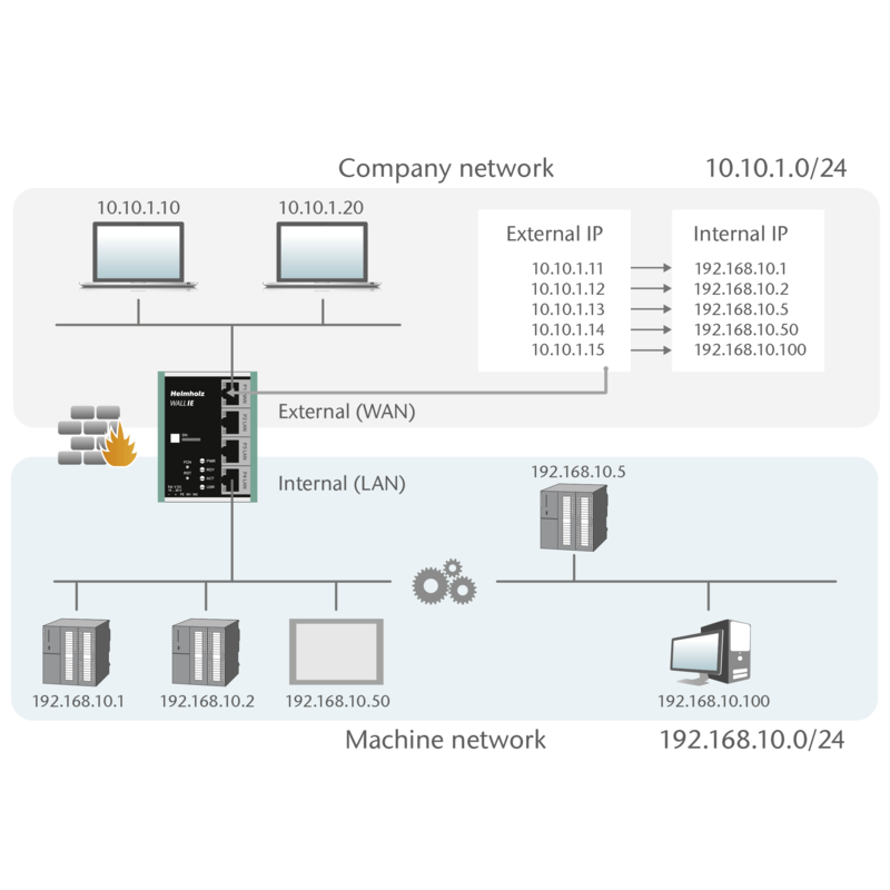 The NAT operating mode serves the forwarding of the data traffic between various IPv4 networks. It enables the address translation via NAT and uses packet filters for the limitation of access to the automation network located behind.